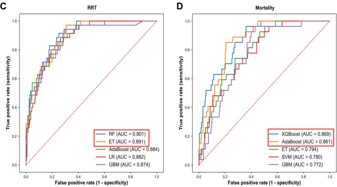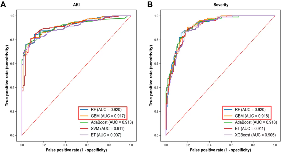 对于 AKI 预测,随机森林(RF)模型表现最佳,其次为梯度提升机(GBM)。