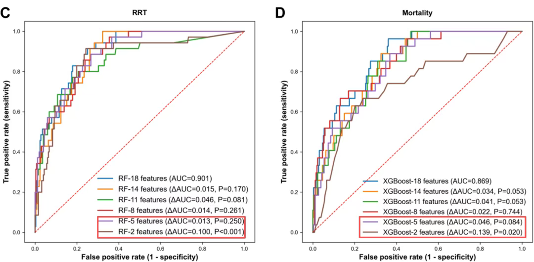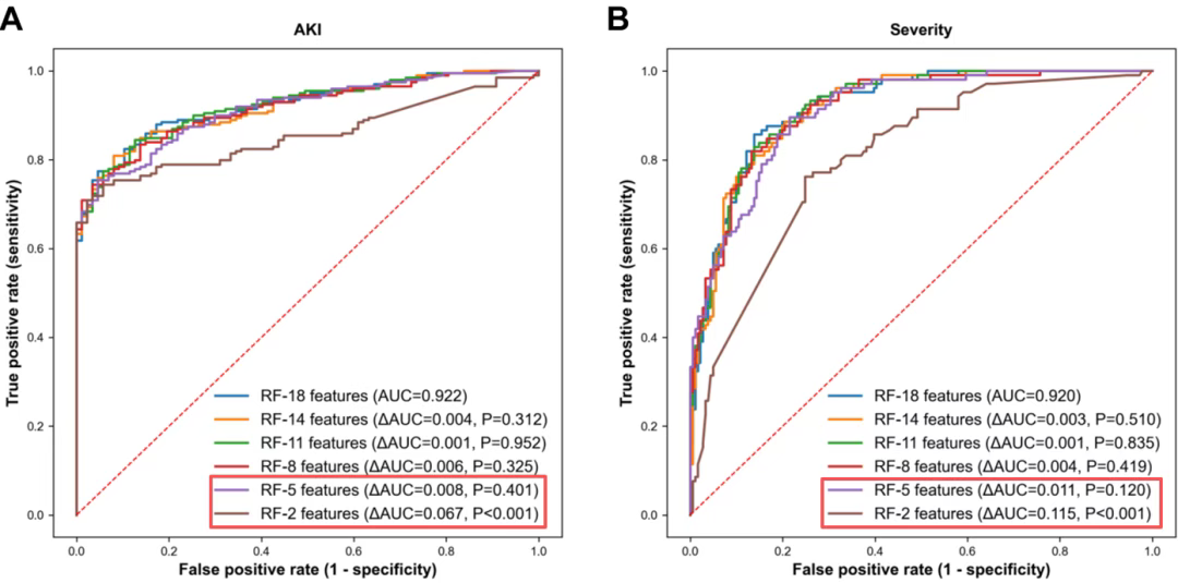 但完整的 18 特征模型与 5 特征模型相比并无统计学显著优势(ΔAUC = 0.008–0.046;均 p > 0.1)。