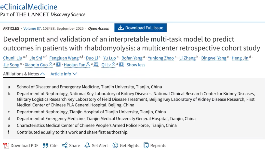 2025年8月21日,天津大学学者在柳叶刀子刊《Eclinicalmedicine》(医学一区,IF=10.0)发表了一项多中心回顾性队列研究,旨在开发并外部验证一套可解释的多任务机器学习(ML)模型,用以预测横纹肌溶解症患者的四项临床结局:急性肾损伤(AKI)、病情严重度、肾脏替代治疗(RRT)需求及院内死亡率。