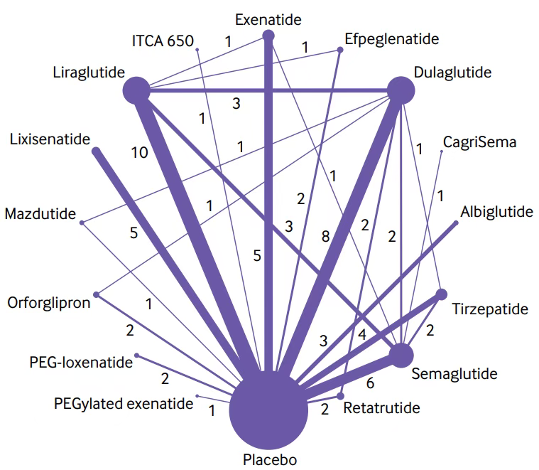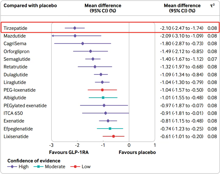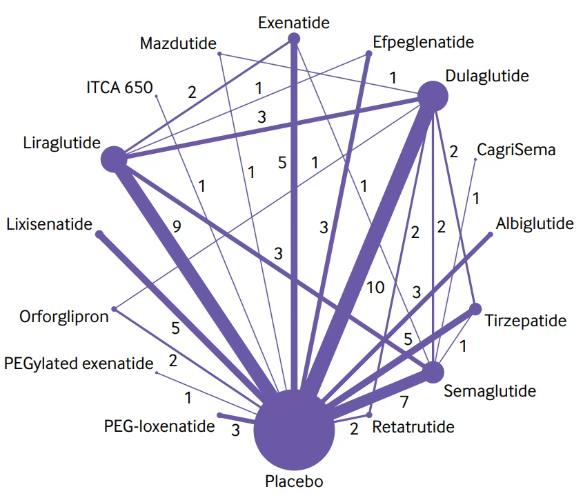 GLP-1RAs被证明对2型糖尿病患者的体重管理有很强的益处。CagriSema(司美格鲁肽联合cagrilintide)的减重效果最好(平均差值为- 14.03kg(95%CI为-17.05至-11.00),证据高置信度),其次是替尔泊肽(tirzepatide)(-8.47kg(-9.68至-7.26),证据高置信度)。单纯司美格鲁肽减重效果排在第5位。