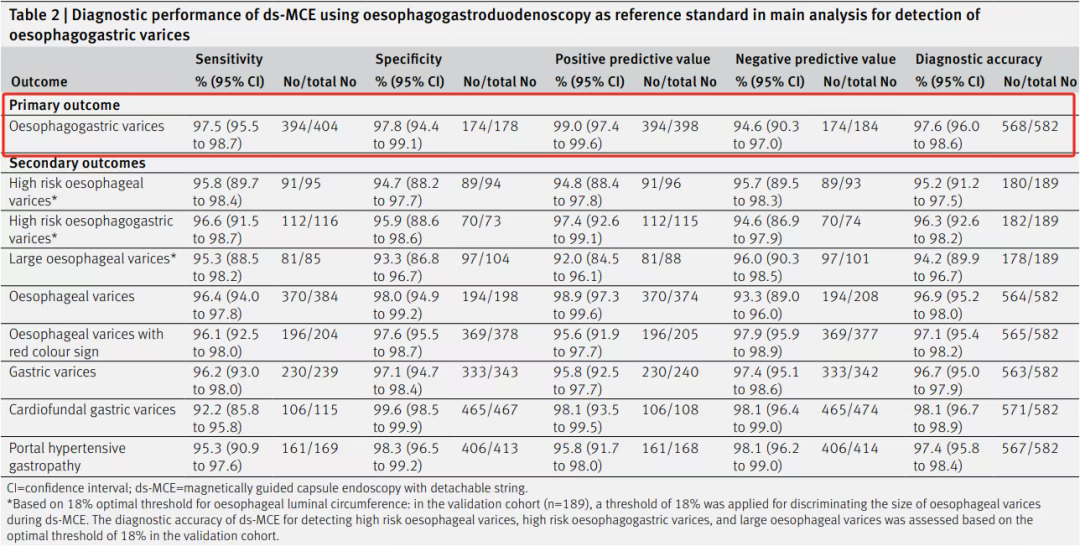 在主要结局分析中,胶囊内镜和胃肠镜检查结果之间的一致性为97.6%,有14名患者在两种检查中的结果不同。当以胃肠镜结果为金标准时,胶囊内镜在检查食管胃底静脉曲张的灵敏度为97.5%(95%CI: 95.5% - 98.7%,P<0.001),特异度为97.8%(95%CI 94.4% - 99.1%,P<0.001),均显著高于预先设定的85%阈值。
