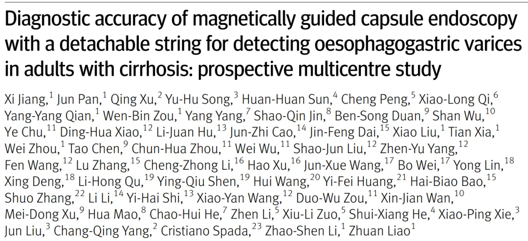 2024年3月5日,由中国上海长海医院团队发明的可拆卸式磁控胶囊内镜试验结果发表在医学顶刊BMJ(英国医学杂志),题为:“Diagnostic accuracy of magnetically guided capsule endoscopy with a detachable string for detecting oesophagogastric varices in adults with cirrhosis: prospective multicentre study”。