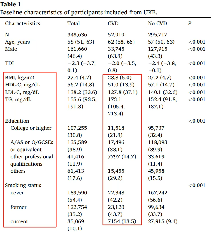 与没有CVD事件的参与者(n=295717)相比,患有CVD的参与者(n=52919)特征为老年人、男性、社会经济贫困、现在或以前吸烟、不经常饮酒、不运动,并且饮食更健康、BMI和TG水平更高、HDL-C和LDL-C水平更低,患有高血压、糖尿病,使用降脂药物以及父母有CVD病史。