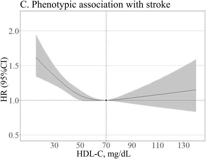 观察到HDL-C浓度与总CVD、CHD和中风风险呈L型关联(所有Ps非线性<0.001)。