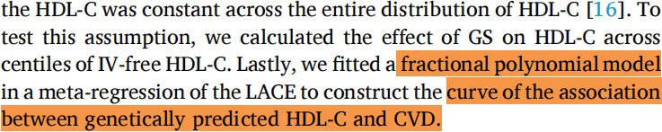 使用分数多项式模型,构建遗传预测的HDL-C和CVD之间的关联曲线。