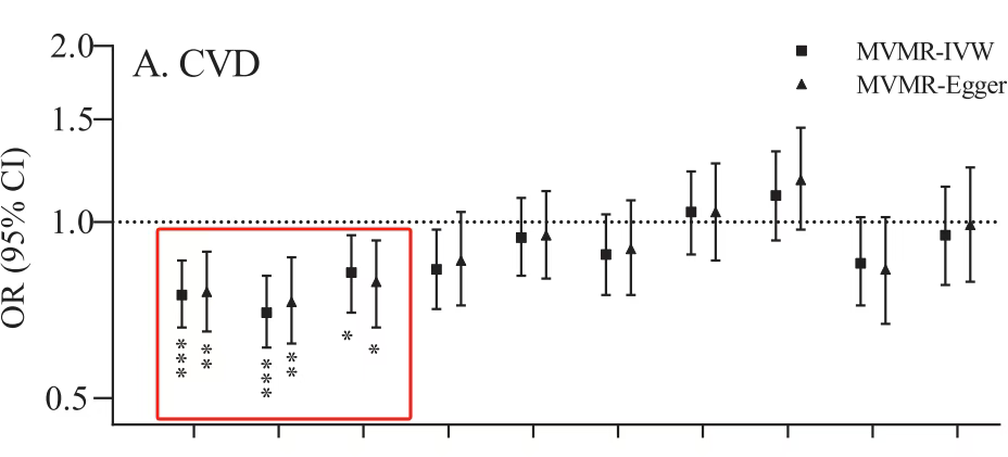采用逆方差加权(IVW)方法作为主要方法,对GLGC获得的脂质和UKB计算的CVD的SNPs梳理效应大小进行MVMR。