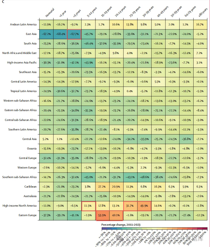 值得注意的是,与GBD 2021相比,撒哈拉以南非洲青少年及年轻成年人的疾病负担远高于既往认知,而老年群体的死亡率则低于先前估计。