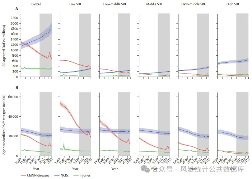 而传染病、母婴及营养不良疾病(CMNN)的负担则显著下降,其中下降最显著的是腹泻病、HIV/AIDS和结核病。