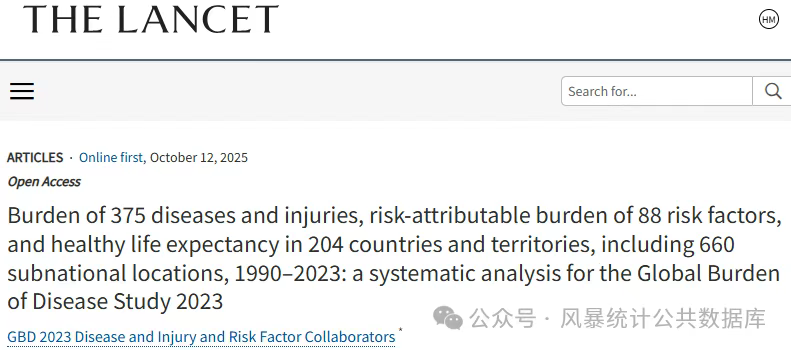 2025年10月12日,GBD 2023疾病和伤害以及风险因素合作者用GBD 2023数据库,在医学顶刊Lancet主刊(医学一区Top,IF=88.5)发表题为:“Burden of 375 diseases and injuries, risk-attributable burden of 88 risk factors, and healthy life expectancy in 204 countries and territories, including 660 subnational locations, 1990–2023: a systematic analysis for the Global Burden of Disease Study 2023”的研究论文。
