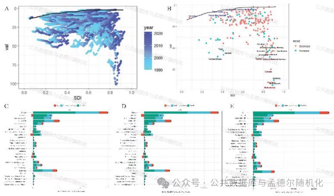 (A, B) 2021年,SDI与高BMI相关性OA负担关联的前沿分析;(C) 21个GBD地区和5个SDI区域,男女高BMI相关性OA的DALYs分解分析;(D)女性-分解分析;(E)男性-分解分析