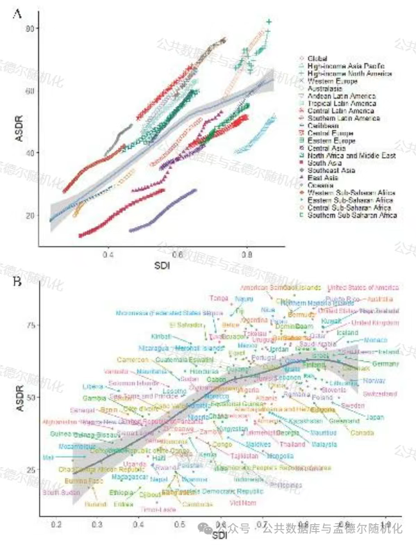 然而,从国家和地区的角度来看,高SDI区的ASDR最高(2021年82.026/10万),但增幅最缓(EAPC=0.47);而南亚增幅最大(ASDR变化率1.110)。