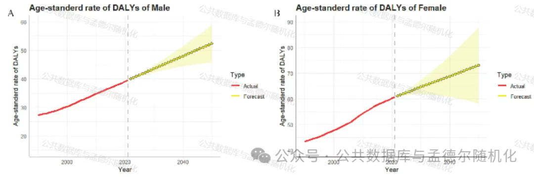疾病负担:基于GBD 2021数据,运用Joinpoint回归识别DALYs率的时间拐点,通过年龄标准化率(ASDR)和分解分析量化人口、老龄化、流行病学变化的贡献度,并采用ARIMA模型预测2050年疾病负担趋势;