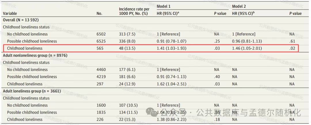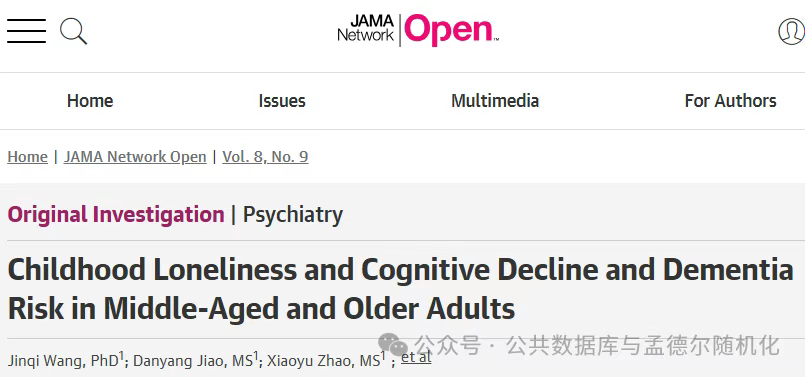 2025年9月2日,首都医科大学学者基于CHARLS数据库,在医学顶刊JAMA子刊《JAMA Network Open》(医学一区Top,IF=9.7)发表了一篇题为:“Childhood Loneliness and Cognitive Decline and Dementia Risk in Middle-Aged and Older Adults”的研究论文,旨在探讨童年孤独是否与中老年期认知能力下降和痴呆风险相关,并进一步检验成年孤独是否在这些关联中发挥介导作用。
