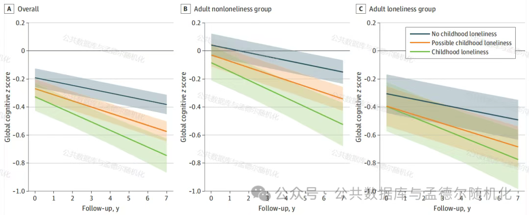 研究结果显示,童年孤独与认知能力加速下降和成年中后期痴呆风险升高显著相关。具体而言,与无童年孤独者相比,童年孤独者认知能力下降明显更快(β = -0.03 SD/年),痴呆风险增加了41%。