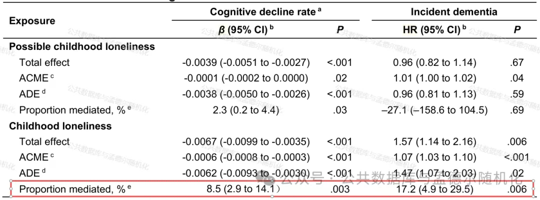 综上所述,童年孤独是中老年期认知衰退和痴呆风险的独立危险因素,且该关联仅部分由成年孤独中介。研究结果支持在生命早期进行干预以减轻孤独感,从而促进终身认知健康并降低痴呆风险。
