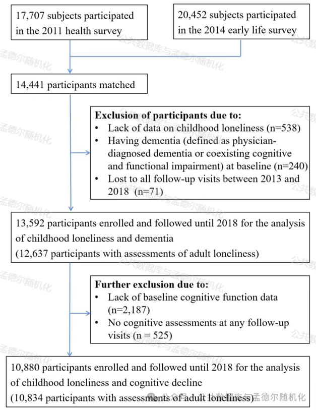 研究通过线性混合效应模型分析童年孤独与认知下降速率的关系,使用Cox比例风险模型评估其与痴呆风险的关联,并采用因果中介分析检验成年孤独的中介作用。