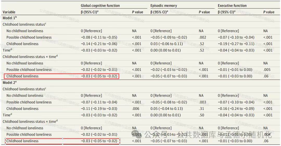 表1 童年孤独与总体人群随访期间认知能力下降之间的关系