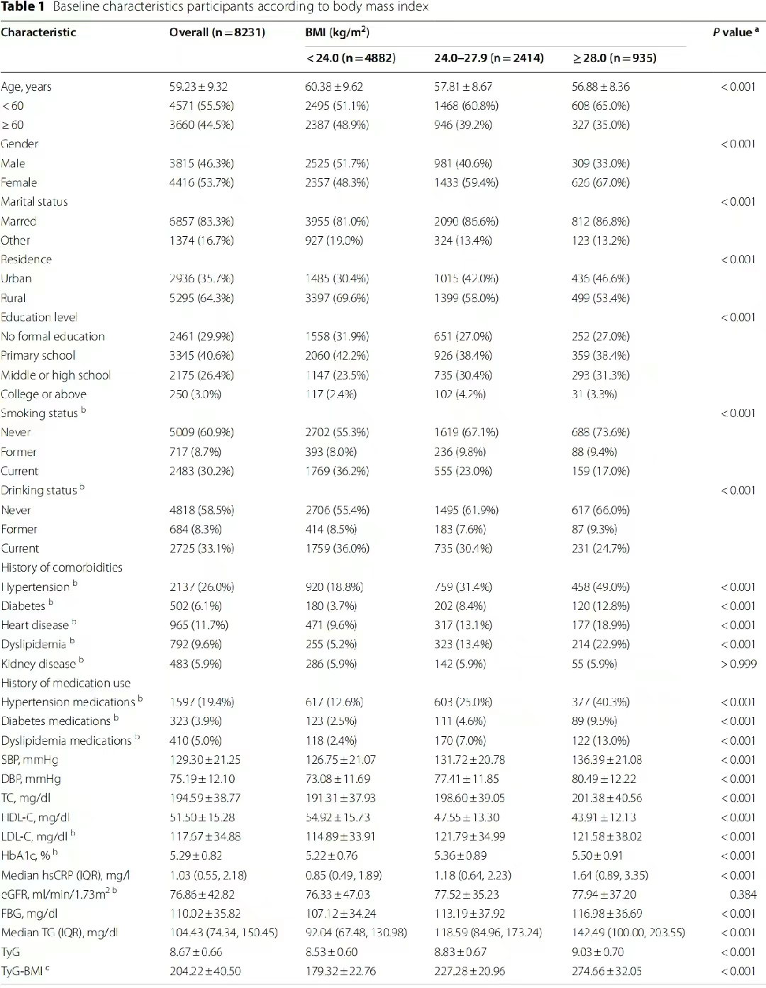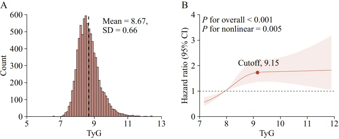 共纳入8231名参与者,平均年龄59.23(9.32)岁,3815名(46.3%)参与者为男性。平均TyG为8.67(0.66),而平均BMI为23.47(3.78)kg/m2。