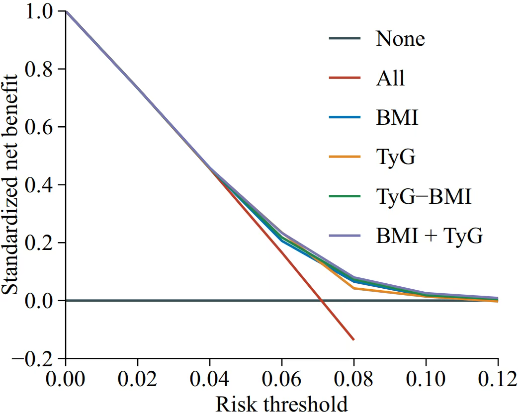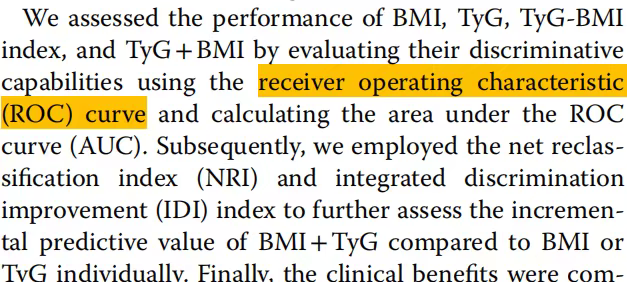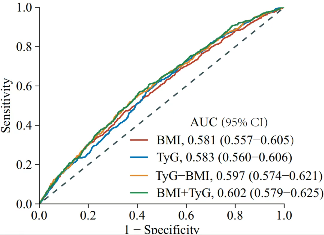 通过评估受试者工作特征(ROC)曲线和计算BMI曲线下面积(AUC),评估BMI、TyG、TyG-BMI指数和TyG+BMI的表现。