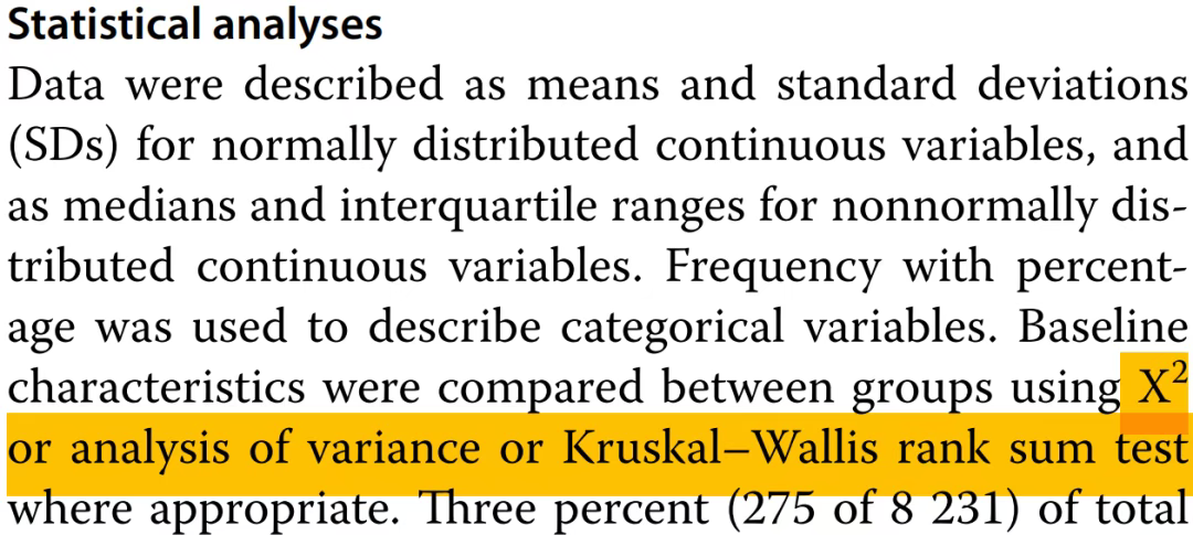 正态分布中的连续变量应该用均数±标准差(SD)来描述,以及非正态分布的连续变量的中位数和四分位间距。使用百分比频率来描述分类变量。在适当的情况下,使用X2或方差分析或Kruskal–Wallis秩和检验对各组之间的基线特征进行比较。