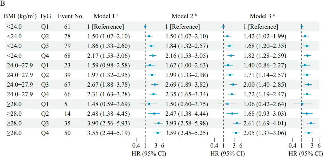 使用Cox比例风险回归模型来估计与BMI(分为<24.0 kg/m2、24.0-27.9 kg/m2,≥28.0kg/m2)和TyG(分为四分位数)相关的结果的风险比(HRs)和95%可信区间(CI)。