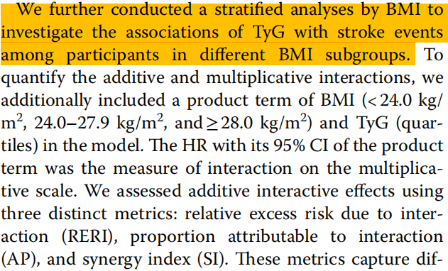 在卒中事件中,BMI和TyG之间没有发现显著的乘法和加法交互作用。