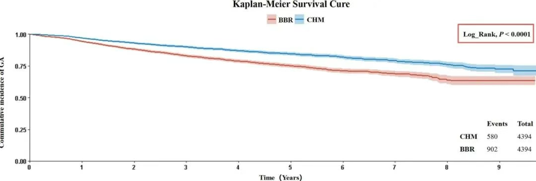 在主要分析中,中药使用者的GA发生率为每千人年34.43例,BBR使用者为每千人年58.00例。与BBR使用者相比,中药使用者发生GA的风险显著降低约43%(HR 0.57,95%CI 0.50–0.65)。