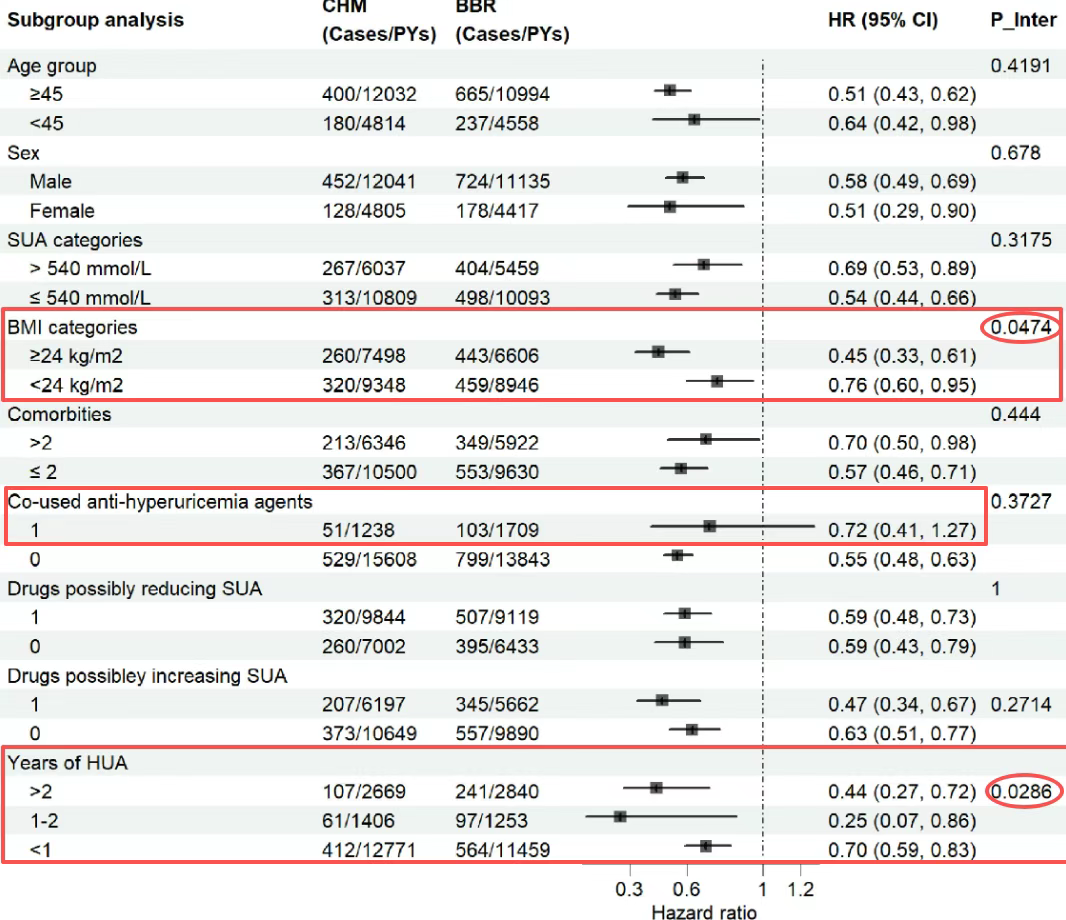 亚组分析显示,在不同的高尿酸血症(HUA)患者亚群中,与BBR组相比,中药使用均显著降低 GA 发病风险,但在合并使用其他抗高尿酸药物的亚组中未见显著。
