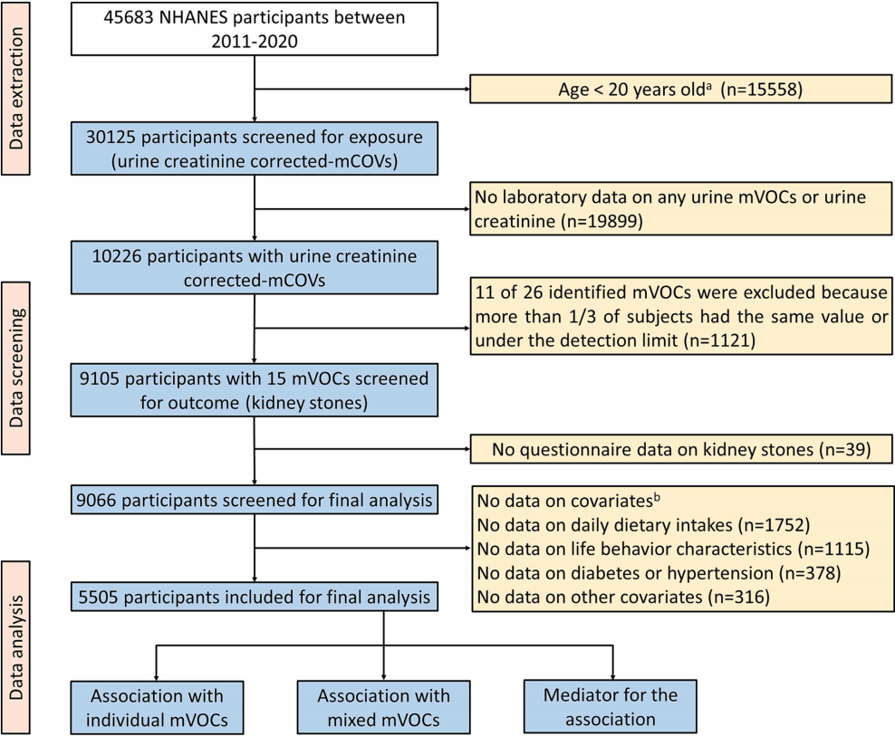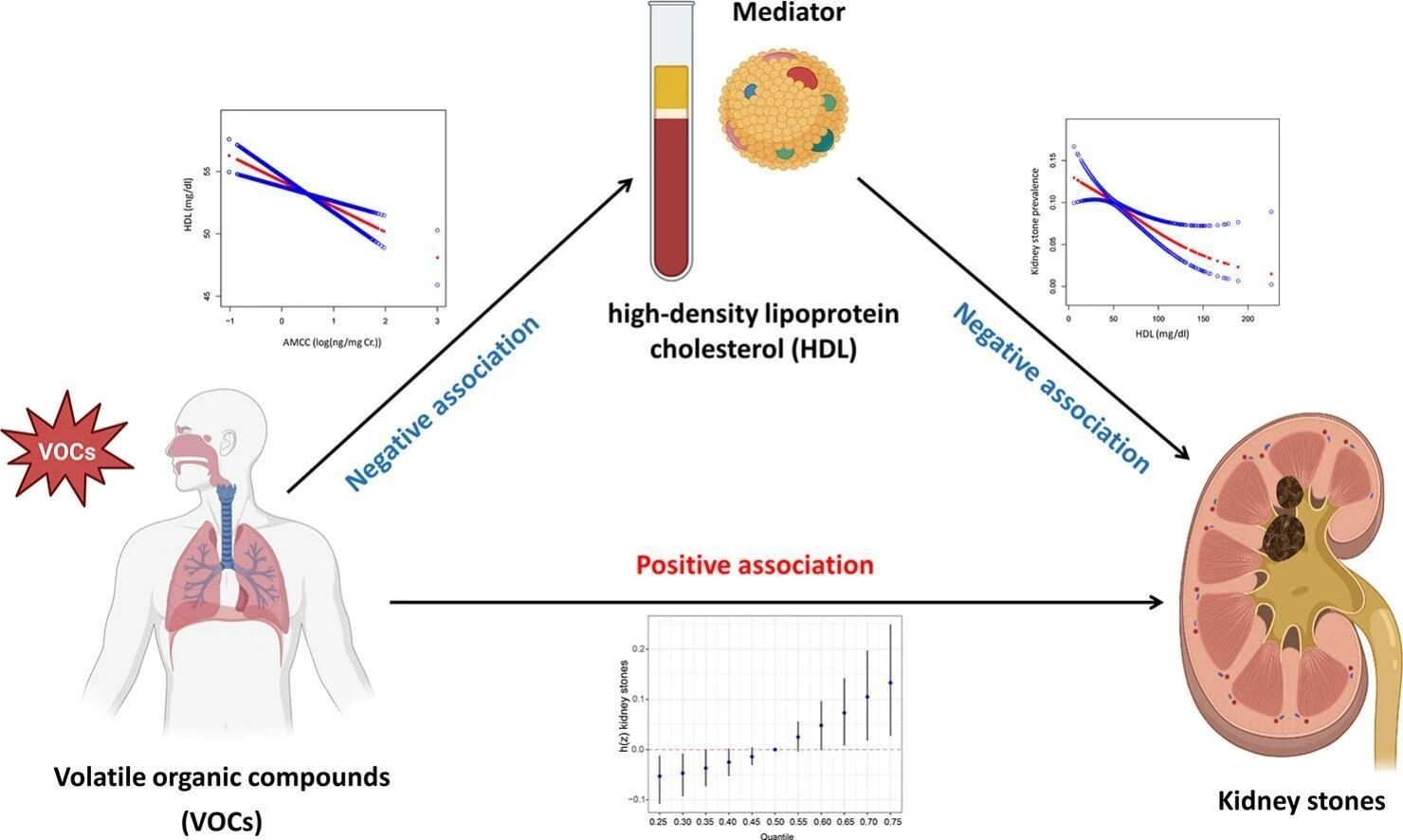 该项队列研究使用美国国家健康和营养检查调查(NHANES)项目的5个调查周期(2011-2020年)的数据,通过尿肌酐校正代谢物挥发性有机物(mVOCs)测定挥发性有机物暴露,探讨暴露于挥发性有机物是否与肾结石的风险有关。结果表明,暴露于VOCs与肾结石风险之间存在正相关,其中尿液AMCC(亲本挥发性有机物(pVOCs):N、N-二甲基甲酰胺)在15种mVOCs中起着最重要的作用。中介分析进一步确定血清高密度脂蛋白胆固醇(HDL)是VOC共暴露与肾结石之间关联的中介。