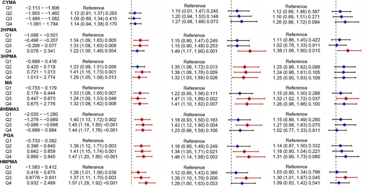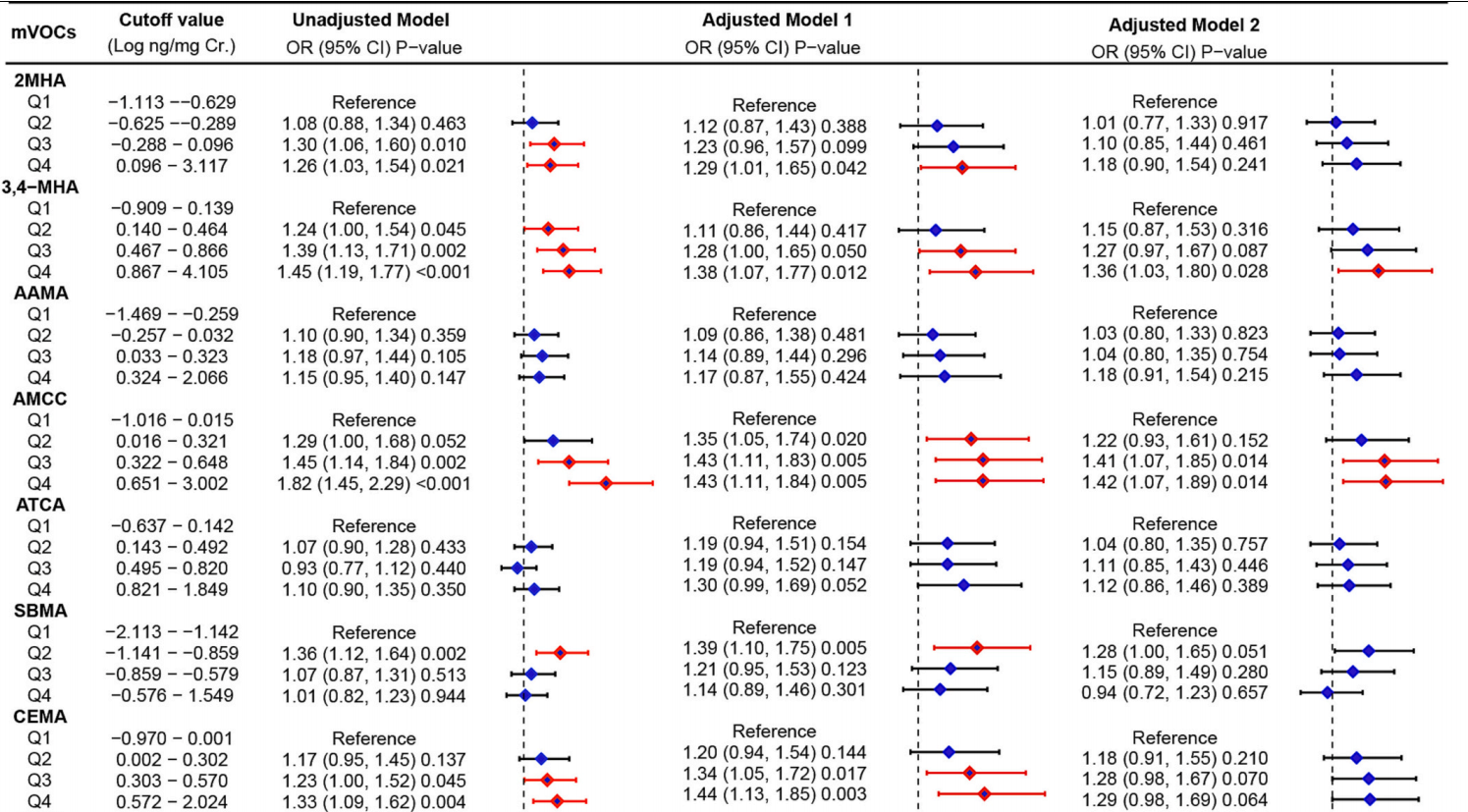 根据尿肌酐校正后的mVOCs,将人群分为四份。与最低四分位数(Q1)相比,未经调整的逻辑回归模型显示2MHA(Q3、Q4)、3,4-MHA(Q2、Q3、Q4)、AMCC(Q3、Q4)、SBMA(Q2)、CEMA(Q3、Q4)、2HPMA(Q2、Q3)、3HPMA(Q3、Q4)、MA(Q2、Q3、Q4)、MHBMA3(Q2、Q3、Q4)、PGA(Q2、Q3、Q4)、HMPMA(Q2、Q3、Q4)、DHBMA(Q2、Q3、Q4)与肾结石呈正相关。