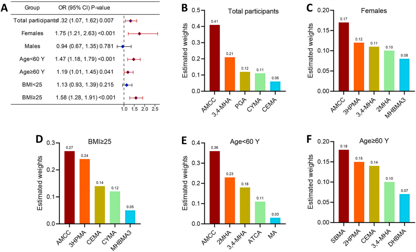 BMI层面,与BMI < 25的亚组相比,超重/肥胖组(BMI≥25)除ACTA外的所有尿肌酐校正的mVOCs水平均较高。调整后的logistic回归模型显示,AMCC(Q3、Q4)、SBMA(Q2),CEMA(Q2),DHBMA(Q4),3HPMA(Q3),和HMPMA(Q4)与肾结石的风险超重/肥胖组,而2MHA(Q4)和AMCC(Q2、Q4)正相关的风险与BMI<25。