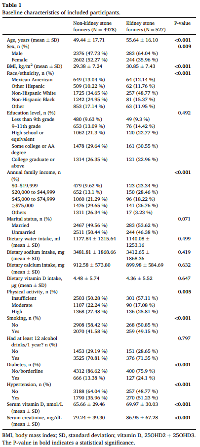 根据是否患有肾结石,参与者被分为肾结石前组(n = 527)和非肾结石前组(n = 4978)。两组患者在年龄、性别、BMI、种族、家庭年收入、体育活动、吸烟史、糖尿病、高血压、血清肌酐水平等方面均有统计学意义的差异。