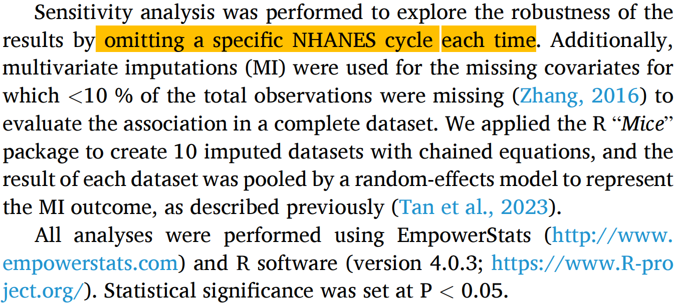 4.敏感性分析:敏感性分析通过每次省略一个特定的NHANES循环来探索结果的稳健性。此外,我们使用多变量推断(MI)对<10%的缺失协变量进行分析,以评估完整数据集中的关联。我们应用R“Mice”包创建了10个具有链接方程的估算数据集,每个数据集的结果被一个随机效应模型合并来表示MI结果,如前所述。所有分析均使用empowerstats进行。empowerstats.com)和R软件。若P < 0.05,则认为有统计学意义。