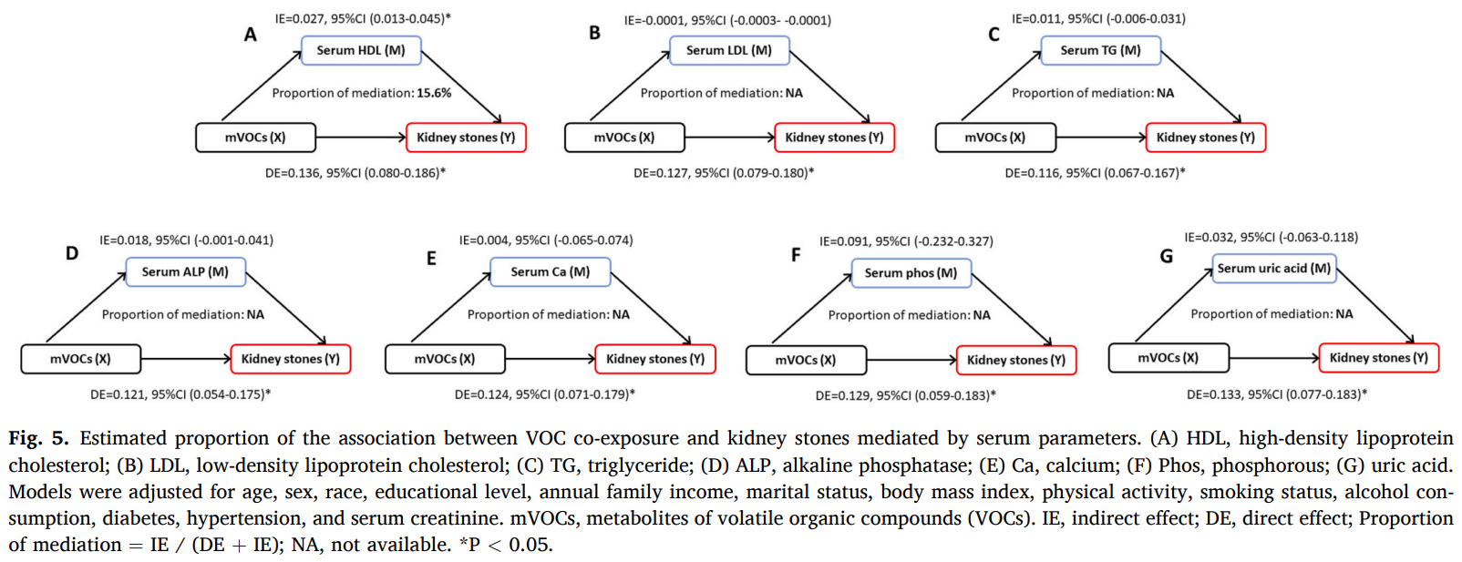 我们进一步评估了血清钙、磷、尿酸、ALP、HDL、LDL和TG水平是否介导VOC共同暴露与肾结石之间的正相关。如图5所示,高密度脂蛋白对这种关联的中介作用为15.6%,而血清钙、磷、尿酸、ALP、LDL或TG没有显著的中介作用。此外,低血清高密度脂素与肾结石风险增加有关(补充图S5A),大多数mVOC与血清高密度蛋白呈负相关(补充图S5 B–P),这符合“X和M之间具有统计学意义的关联”和“M和Y之间具有统计学显著的关联”的条件,以考虑中间效应的发生。