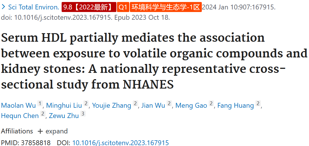 2024年1月,中国学者在《science of the total environment》(一区,IF=9.8)发表题为:"Serum HDL partially mediates the associationbetween exposure to volatile organic compounds andkidney stones: A nationally representative crosssectional study from NHANES" 的研究论文。