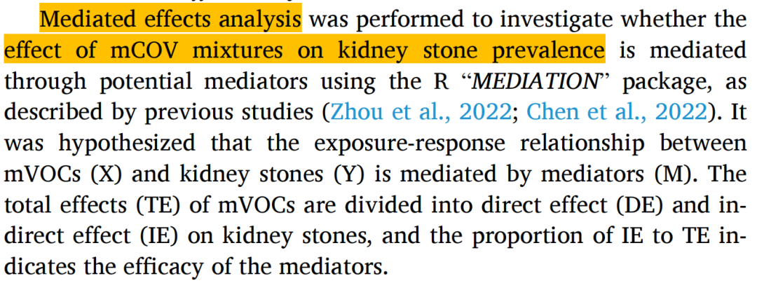3.中介效应分析:采用中介效应分析,研究mCOV混合物对肾结石发病率的影响是否通过使用R“MEDIATION”包的潜在介质介导,如之前的研究所述。我们推测,mVOCs (X)和肾结石(Y)之间的暴露-反应关系是由介质(M)介导的。mVOCs的总效应(TE)分为对肾结石的直接效应(DE)和间接效应(IE),IE占TE的比例表示介质的疗效。