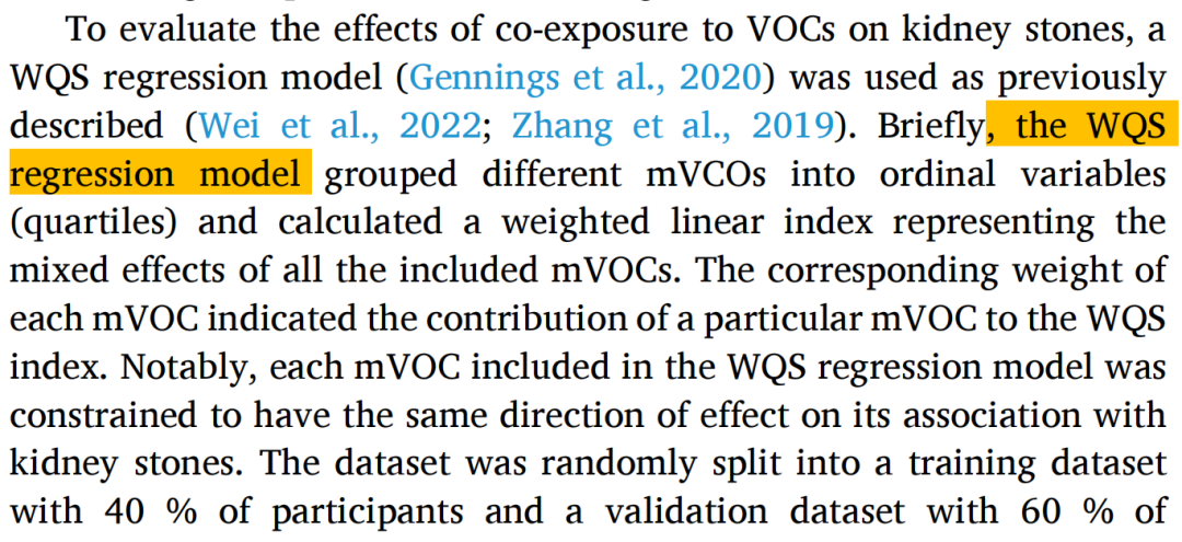 1、加权分位数和(WQS)回归模型:为了评估挥发性有机物共同暴露对肾结石的影响,我们使用了WQS回归模型。简单地说,WQS回归模型将不同的mVCOs分组为序数变量(四分位数),并计算出一个加权线性指数,代表所有纳入的mVOCs的混合效应。每个mVOC的相应权重表示一个特定的mVOC对WQS指数的贡献。值得注意的是,WQS回归模型中包含的每个mVOC都被限制为对其与肾结石的相关性具有相同的影响方向。将数据集随机分为40 %参与者的训练数据集和60 %参与者的验证数据集,使用R“gWQS”包引导1000次后建立模型。