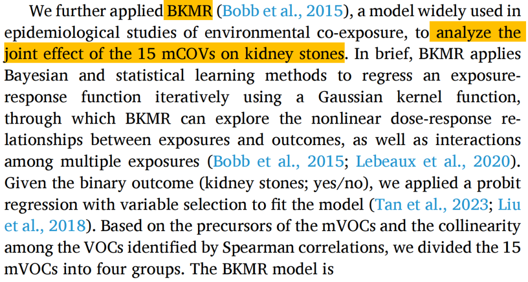 2.贝叶斯核机回归(BKMR)模型:我们进一步应用BKM,一个广泛用于环境共暴露的流行病学研究的模型,来分析15个mcov对肾结石的联合效应。简而言之,BKMR应用贝叶斯和统计学习方法,使用高斯核函数迭代回归暴露响应函数,通过该函数,BKMR可以探索暴露和结果之间的非线性剂量响应关系,以及多次暴露之间的相互作用。考虑到二元结果(肾结石;是/否),我们采用了带有变量选择的先证回归来拟合模型。基于mVOCs的前体和由Spearman相关性鉴定的挥发性有机物之间的共线性,我们将15个mVOCs分为四组。BKMR模型是