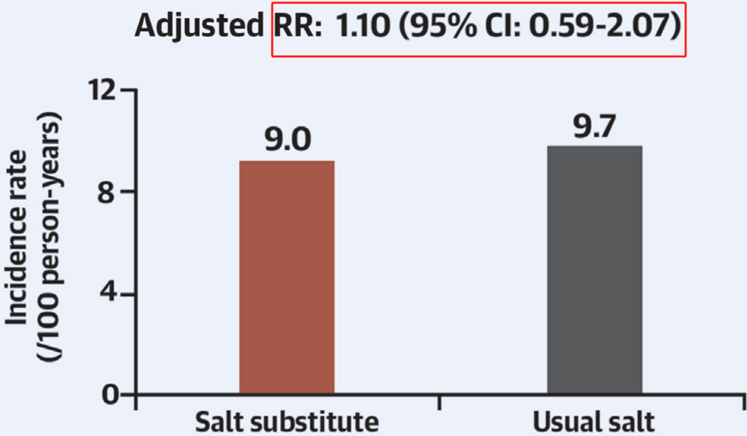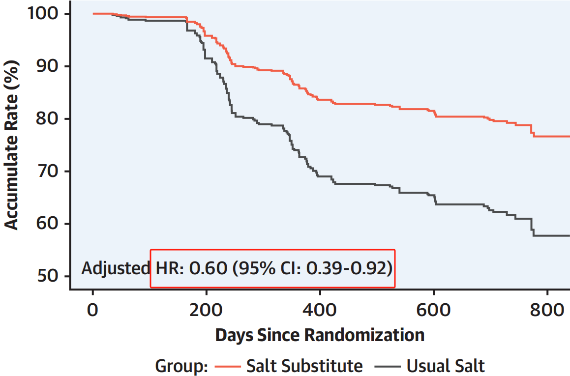 研究结果表明,低血压发作的发生率在代盐组和常规盐组之间没有差异(9.0/100人年vs 9.7/100人年,调整HR=1.10,95% CI:0.59~2.07,P<0.760)。