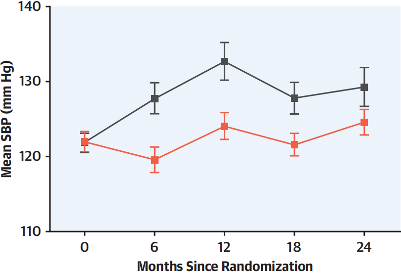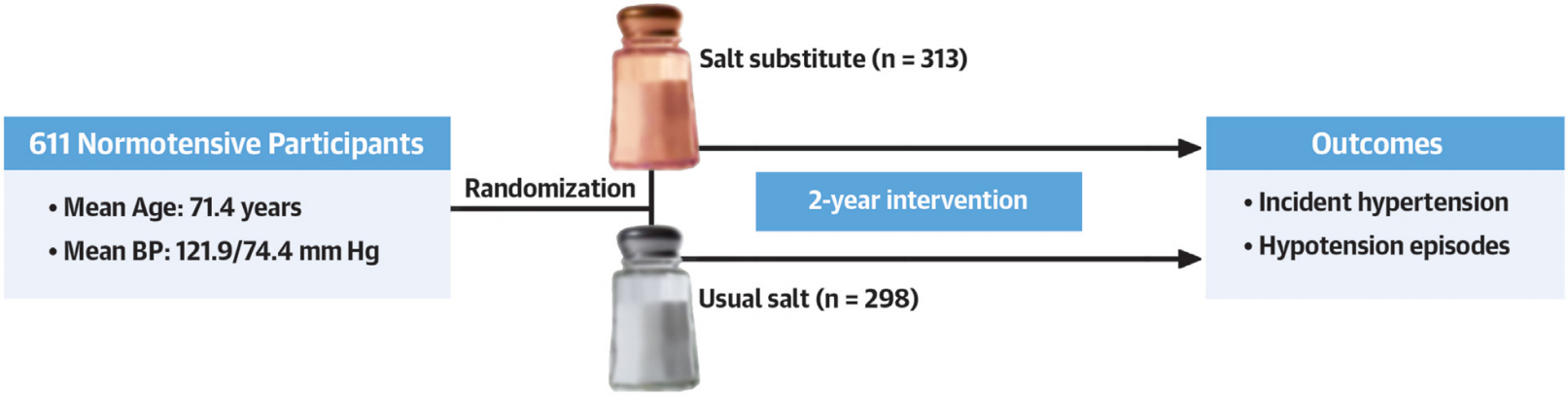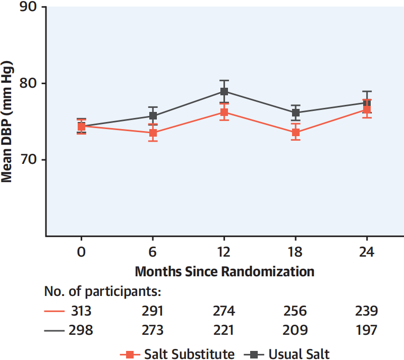 由于在试验中的限盐策略并不成功,因此本事后分析仅关注代盐策略。随后的分析共纳入611名基线时血压正常的参与者,平均年龄为71.4岁,平均血压为121.9/74.4 mm Hg,74.3%为男性,其中: