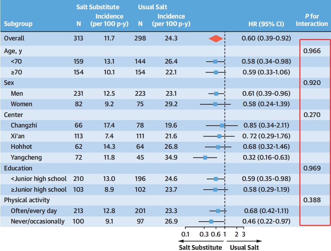 研究表明,与通常使用盐的参与者相比,使用盐替代品的参与者患高血压的可能性降低了40%(调整后风险比[HR] =0.60,95% CI:0.39~0.92,P=0.020)。