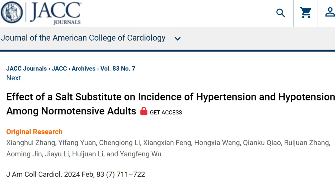 2024年2月12日,北京大学武阳丰团队在顶级期刊JACC(一区top,IF=24)发表了一篇题为" Effect of a Salt Substitute on Incidence of Hypertension and Hypotension AmongNormotensive Adults "的研究论文。本文探究在血压正常的老年人群中,代盐干预是否能预防高血压,是否会增加低血压发作的风险。研究结果表明,在血压正常的中国老年人中,用盐替代普通盐可降低高血压的发生率,而不增加低血压发作。