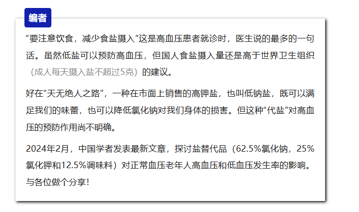 既然没办法减少盐的使用,那就想办法代替。代盐,一种食用盐的低钠替代品,其味道与盐一样,但是减少了钠的含量,目的是减少摄入过多氯化钠导致的高血压和心血管疾病风险。有研究表明,使用低钠含钾的代盐可有效降低血压,预防心血管疾病。但应用代盐是否真的能预防高血压?是否会适得其反,反而引起低血压?