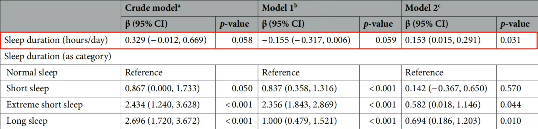 研究发现,在完全调整的模型中,与正常睡眠组相比,短睡眠、极短睡眠、长睡眠均与表型年龄之间呈正相关[粗模型,β=0.329,95%CI(−0.012,0.669),p=0.058;模型1,β=−0.155,95% CI(−0.317,0.006),p=0.059]。