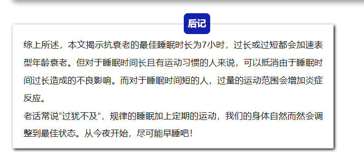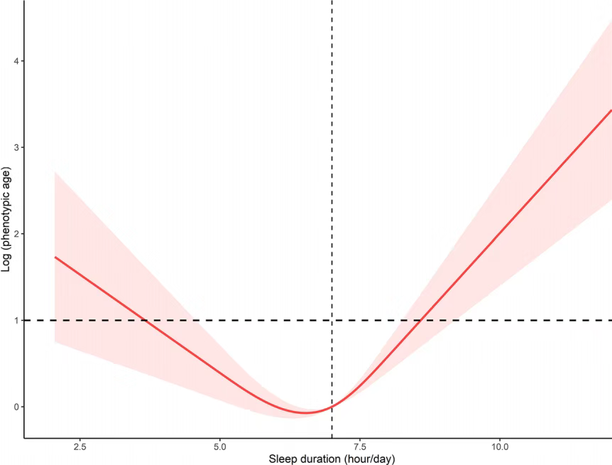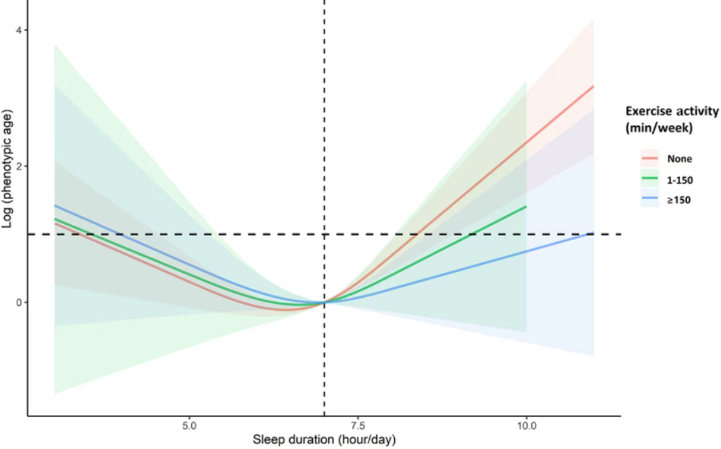 研究结果表明,7小时睡眠最佳,过长过短的睡眠时间都增加表型年龄,促进生物学衰老。此外,运动水平显著调节睡眠和衰老之间的关系。