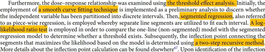 然后,使用分段回归,即利用单独的线段来计算每个区间。采用对数似然比检验,将单行(非分段)模型与分段回归模型进行比较,以确定是否存在一个阈值。