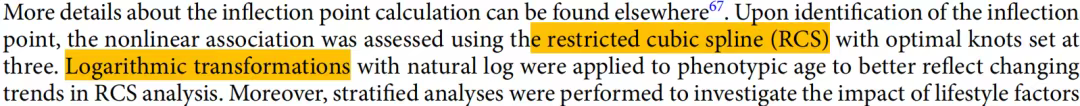 4.在确定了感染点后,使用最优结设置为3的限制性立方样条(RCS)回归模型来评估非线性关联。采用自然对数对数变换分析表型年龄,更好地反映RCS分析的变化趋势。