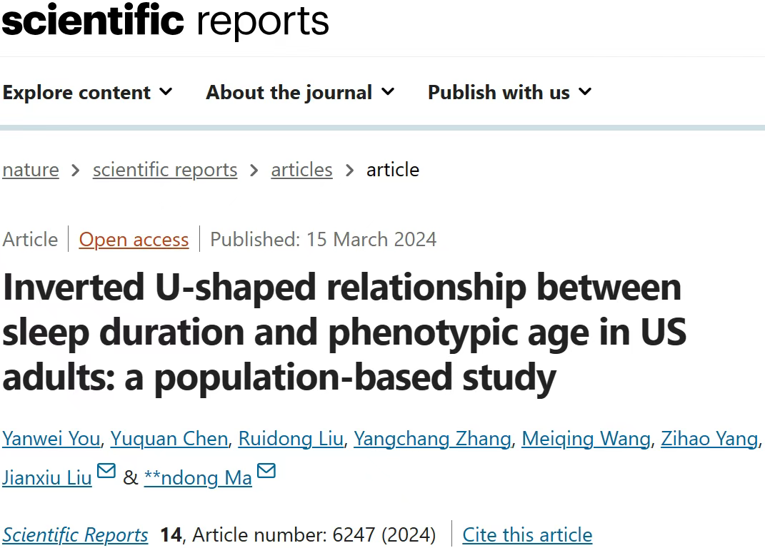 2024年3月15日,清华大学学者在期刊Scientific Reports(二区,IF=4.6)发表了一篇题为:“Inverted U-shaped relationship between sleep duration and phenotypic age in US adults:a population-based study ”的前瞻性队列研究,探究睡眠持续时间与衰老之间的关系,以及其他生活方式是否在睡眠和衰老中发挥作用。