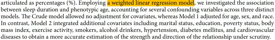 2.采用加权线性回归模型,探讨睡眠时间和表型年龄之间的关系,解释了三个不同模型中的几个混杂变量。