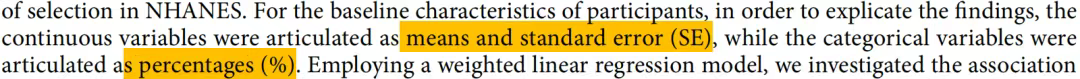 1.统计描述方法:对于参与者的基线特征,为了解释概念,连续变量以均值和标准误差(SE)表示,而分类变量以百分比(%)表示。